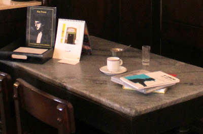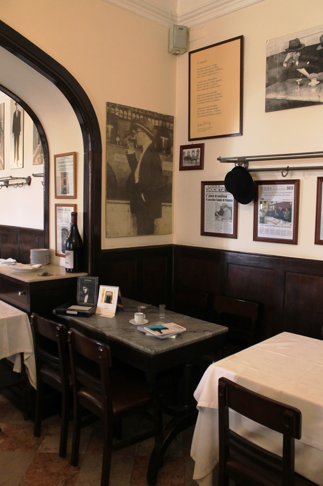 Nos dirigimos con cierta emoción a la última puerta bajo la agradable sombra de las arquerías pombalinas y de golpe nos encontramos frente a frente con ella, sin mantel, con una taza de café, el azucarero, un vaso de absenta y algunos libros para releer esperándole.