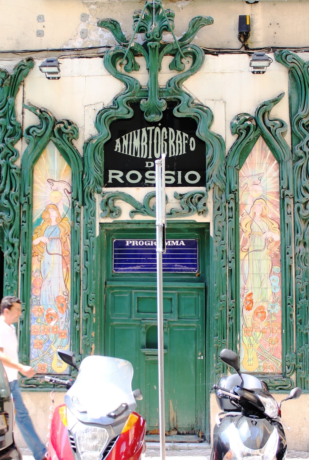 Continuando por el lado Sur de la plaza atravesamos un arco por el que se accede a la Rua dos Sapateiros. Allí permanece la primera sala de cine lisboeta, el Animatógrafo do Rossio que con su fachada Arte Nova continúa hoy proyectando películas, actualmente de serie X. Lo incluimos aquí por la belleza de su fachada aunque no hay constancia de ninguna afición de Pessoa por el séptimo arte.